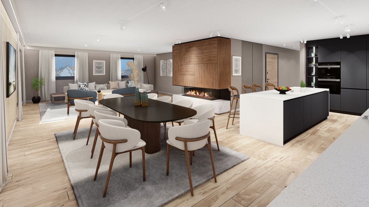 Die Wohnung besteht aus einem geräumigen Wohnzimmer, Küche und Esszimmer, fünf Schlafzimmern, fünf Badezimmern, Flur und Terrasse. Zur Wohnung gehört auch eine Garage, zwei Abstellräume und eine Dachterrasse, was eine Gesamtfläche von 253 m2 ergibt. Die Wohnung ist mit einer Gas-Fußbodenheizung ausgestattet, ein Holzkamin wurde installiert und sie verfügt über 6 Klimaanlagen (Wohnzimmer und jedes Schlafzimmer).