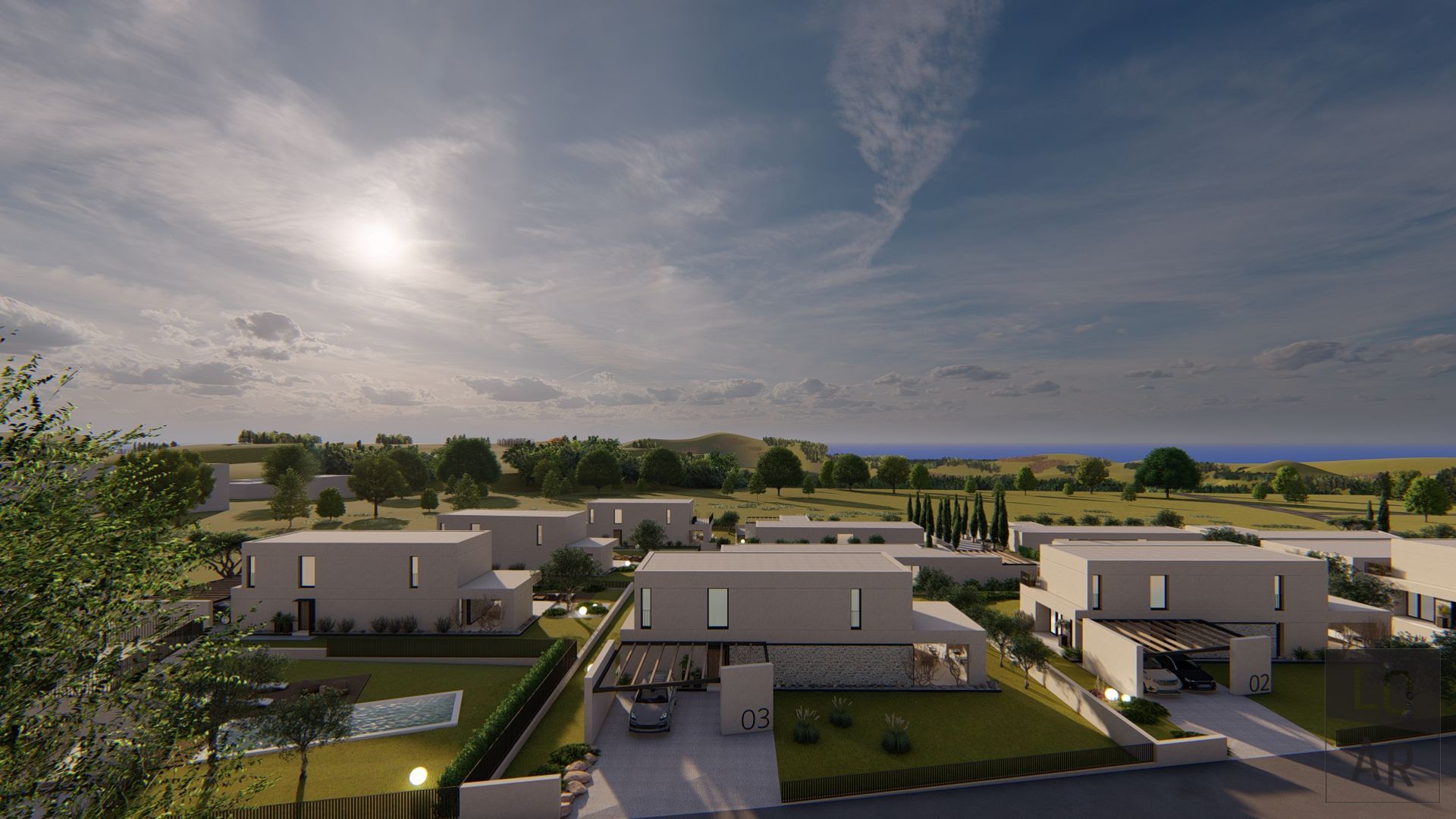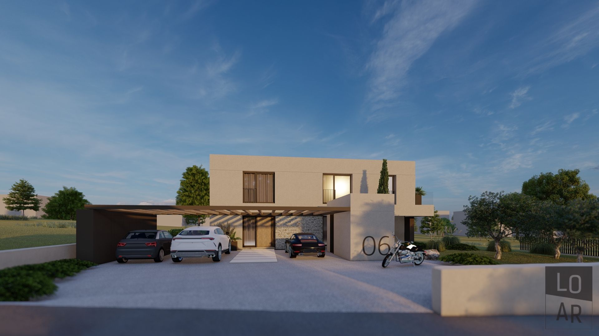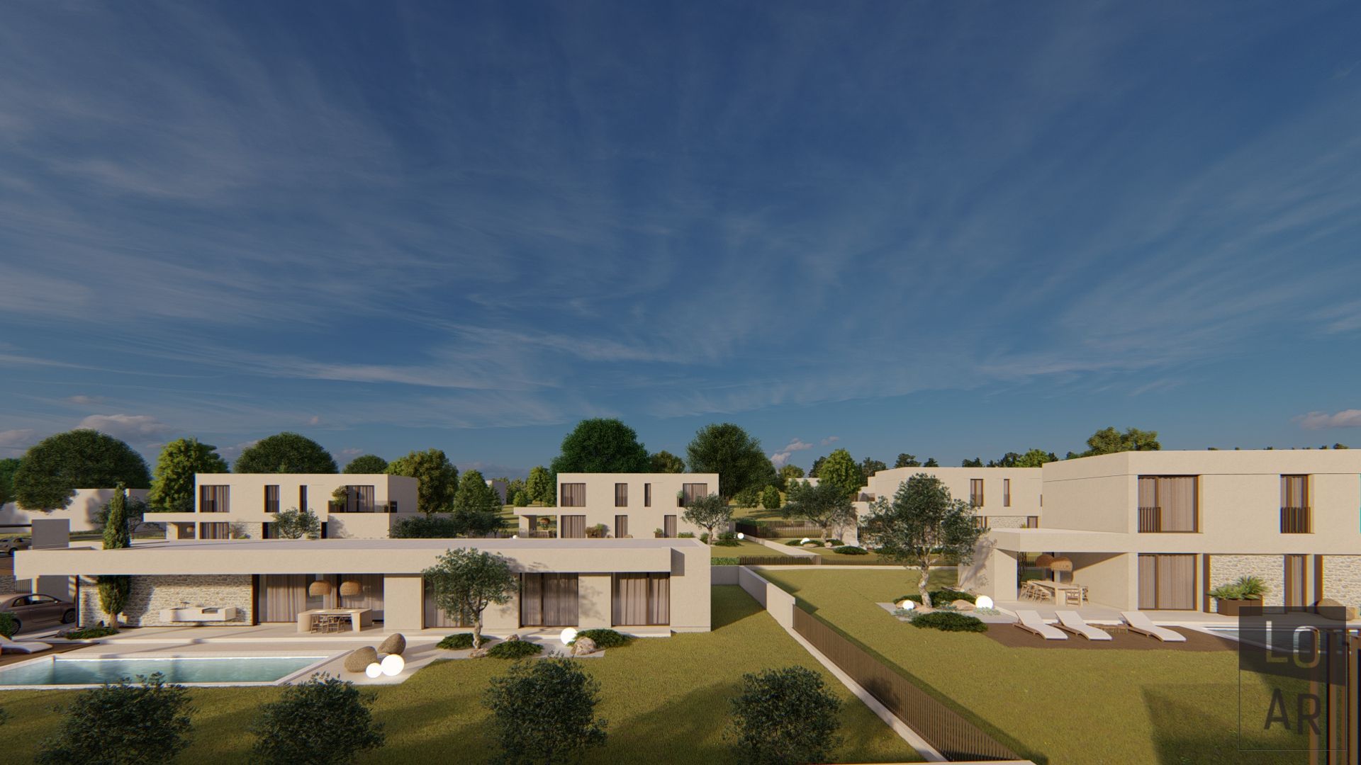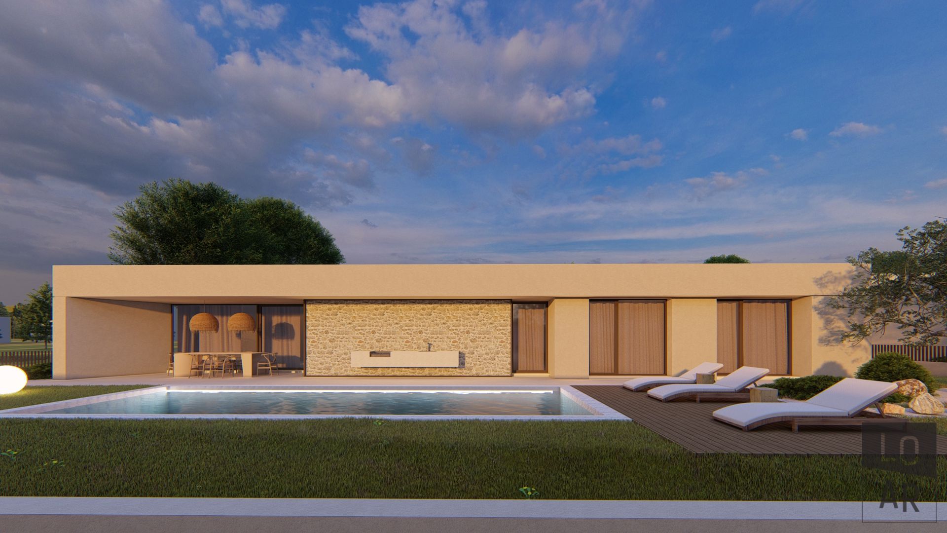 Ein schlüsselfertiges Projekt mit fertiggestellter Außenanlage und Pool. Möbel und Lampen sind nicht im Preis eingeschlossen.