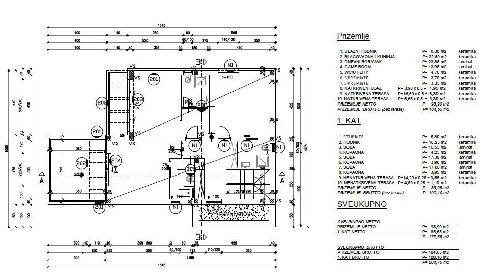 Die Villa erstreckt sich über 2 Etagen. Im Erdgeschoss gibt es einen Eingangsbereich, Küche, Esszimmer, Wohnzimmer, Toilette, Abstellräume, ein Spielzimmer und eine großzügige überdachte Terrasse mit geplanter Außenküche. Die Innentreppe führt in den 1. Stock, wo sich ein Flur, 3 Schlafzimmer mit eigenem Bad und 2 schöne Terrassen mit einem zauberhaften Blick auf das Meer befinden.