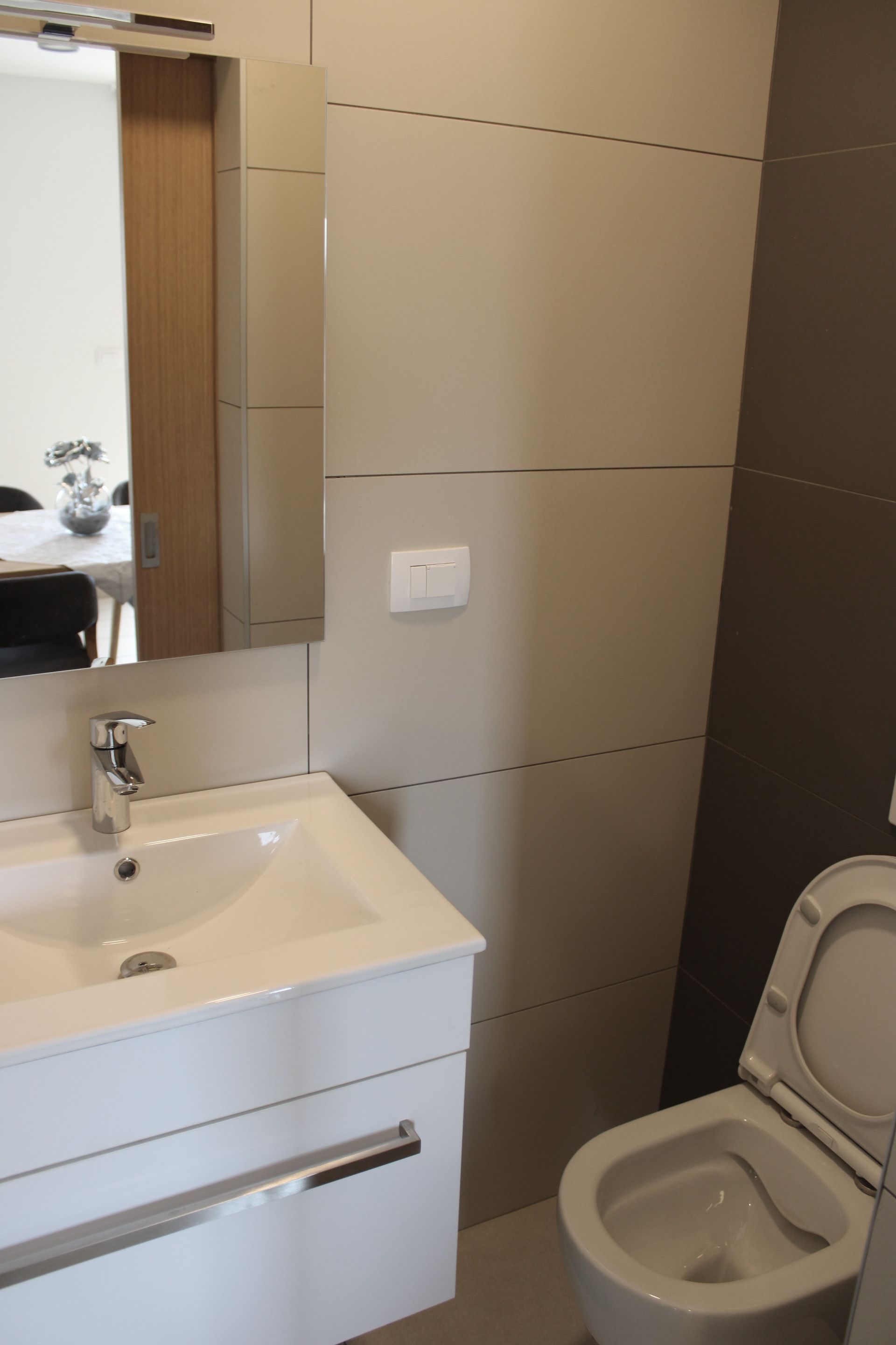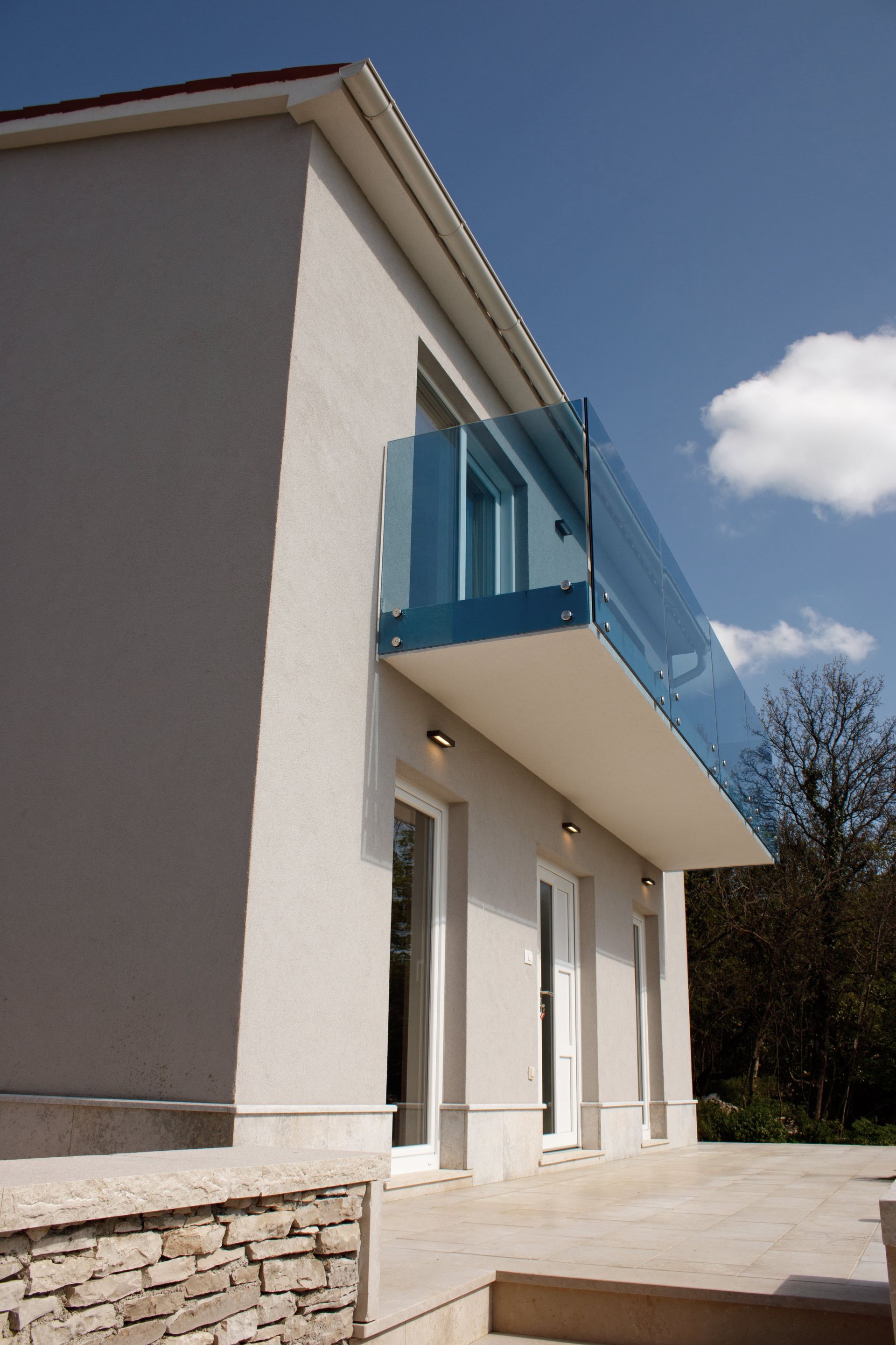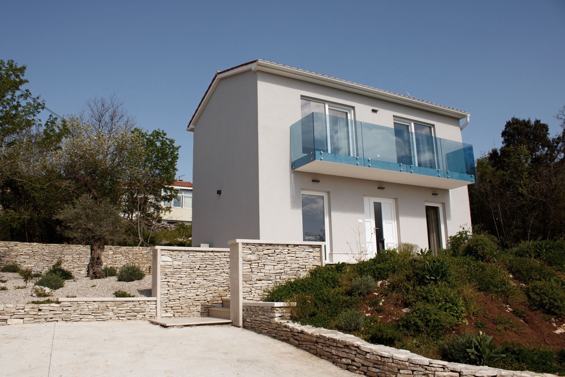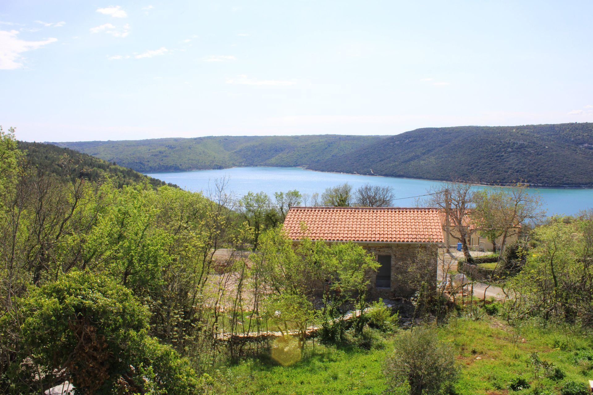 Das Haus erreichen Sie über eine kleine Zufahrtsstraße/Sackgasse. Es wurde auf der rechten Seite, in zweiter Reihe, auf einer Anhöhe errichtet. Am unteren Fuß des Hauses befinden sich zwei Stellplätze. Stufenlos erreichen Sie den Eingangsbereich. Sie betreten das Haus und finden auf der ebenerdigen Ebene das offene Wohnraumkonzept mit Küchenzeile sowie dem großzügigen Wohn/Eßbereich. Des weiteren finden Sie auf dieser Ebene ein Gäste-WC und einen kleinen Technikraum. Die angrenzende Terrasse verläuft um das gesamte Gebäude. Den Blick auf den Raša-Fjord können Sie auf der Sonnenterrasse genießen und falls Sie etwas Schatten benötigen finden Sie im hintern Teil des Hauses eine überdachte Terrasse, dort haben Sie einen Blick auf den hoch verlaufenden Hang mit einem Altbestand an Olivenbäumen.