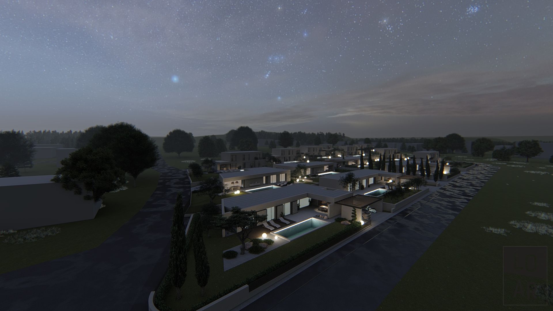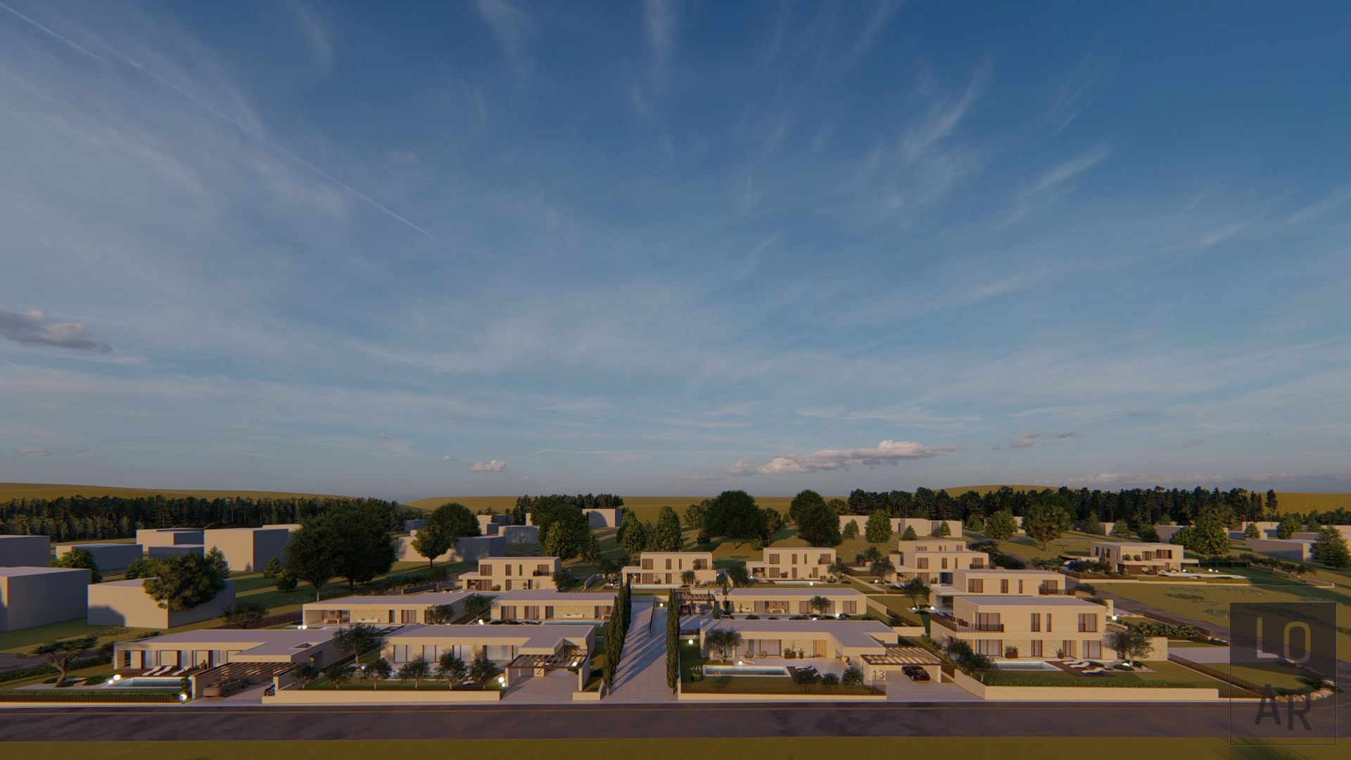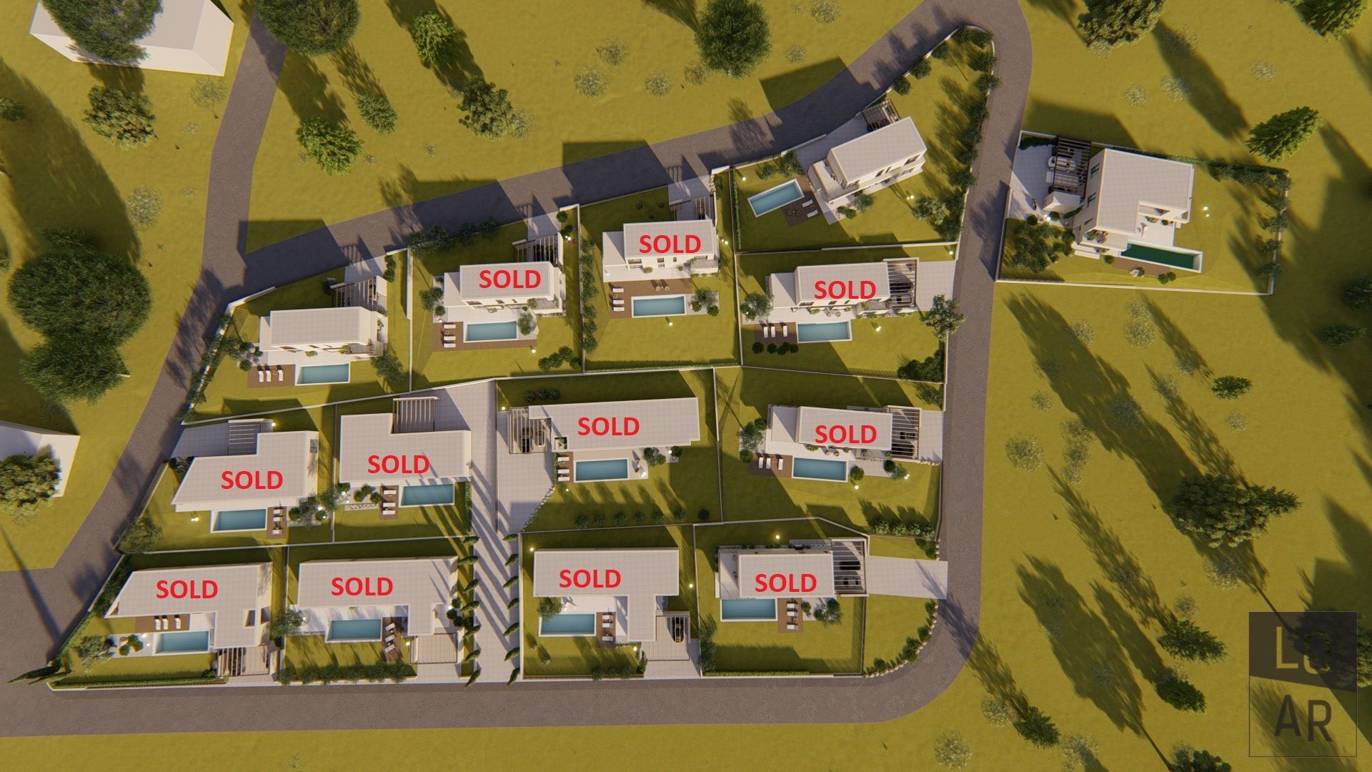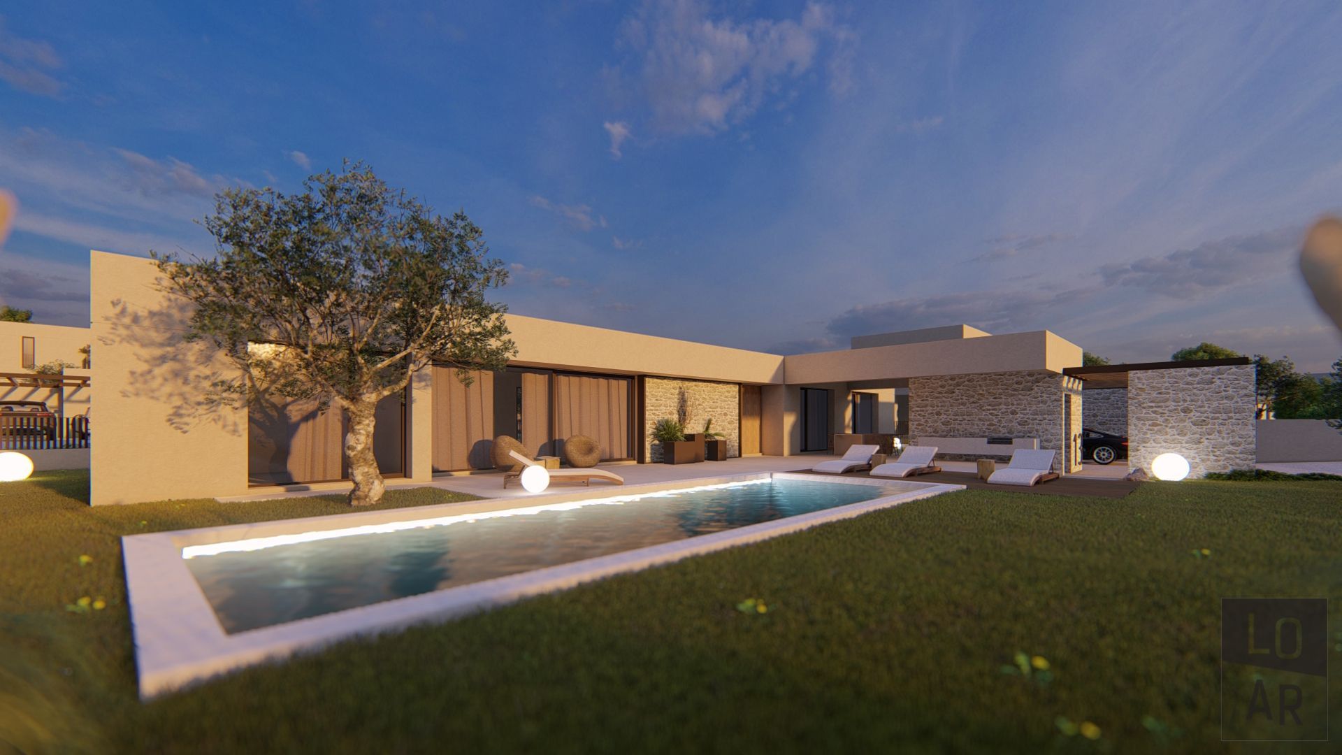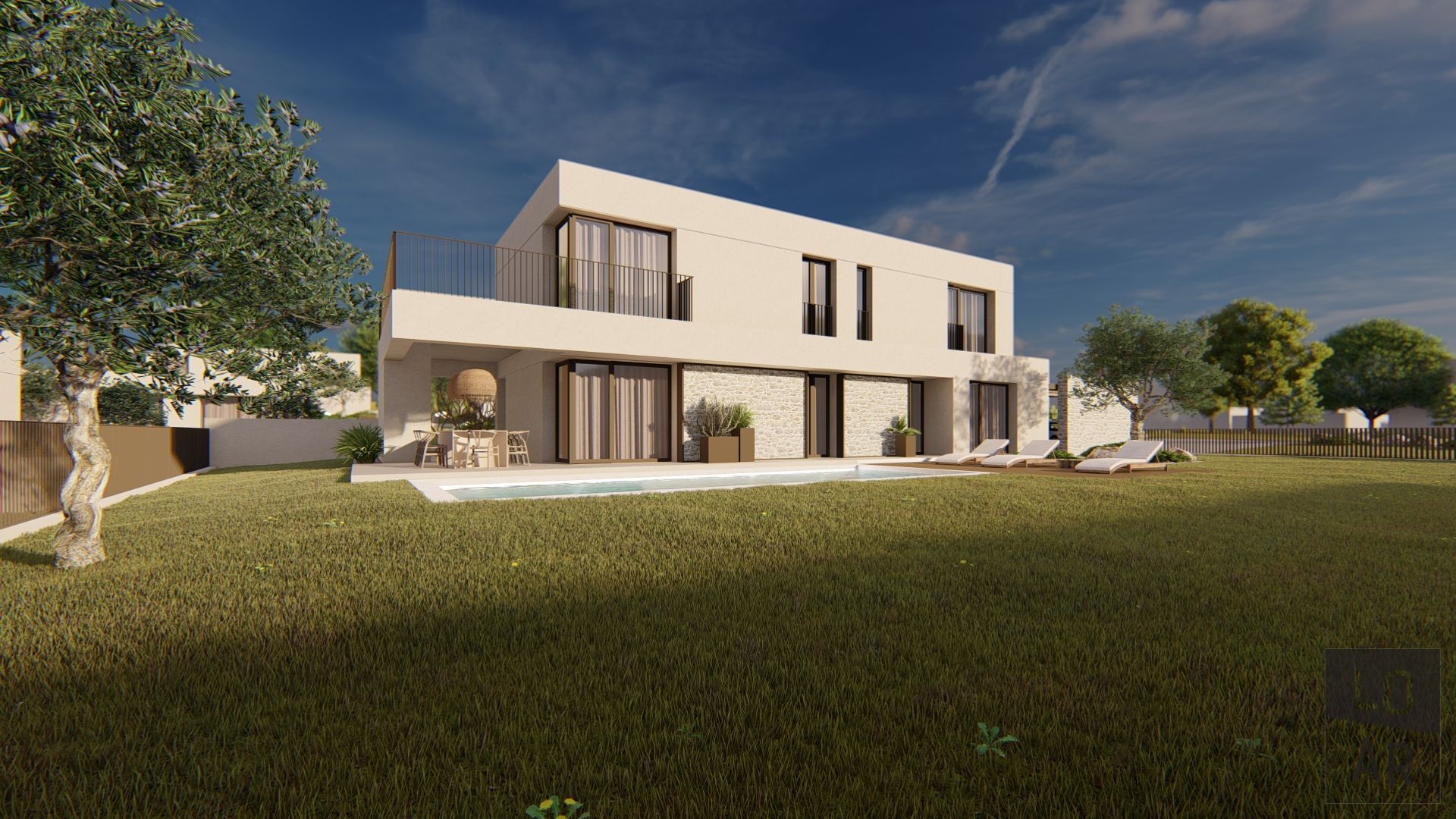 Ein schlüsselfertiges Projekt mit fertiggestellter Außenanlage und Pool. Möbel und Lampen sind nicht im Preis eingeschlossen.